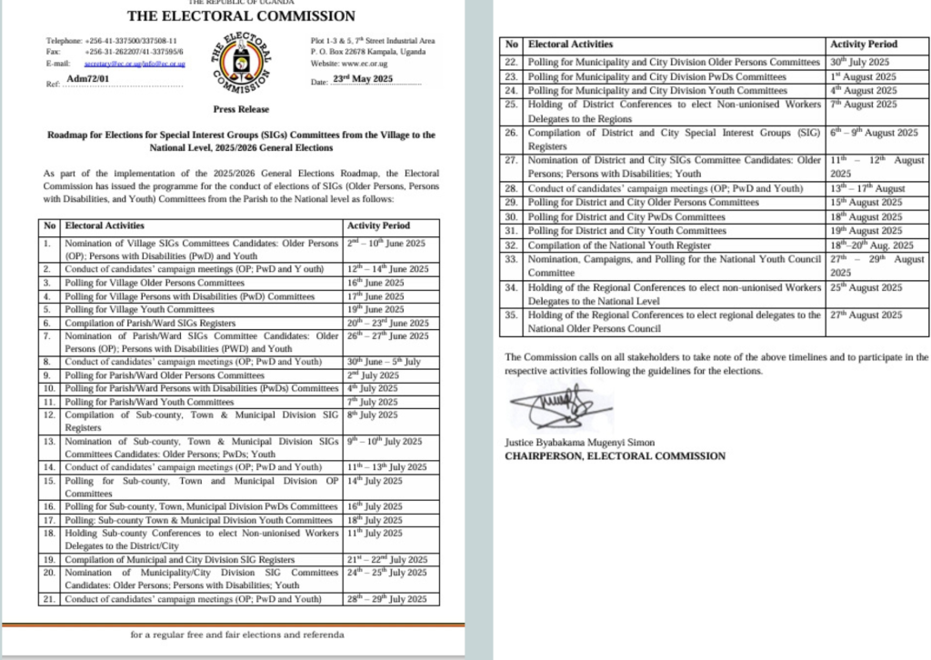As preparations for the 2026 General Elections Uganda intensify, the Uganda Electoral Commission (EC) has rolled out election activities for Special Interest Groups (SIGs) — Youth, Persons with Disabilities (PWDs), and Older Persons — in line with the approved Uganda Electoral Commission 2026 roadmap.